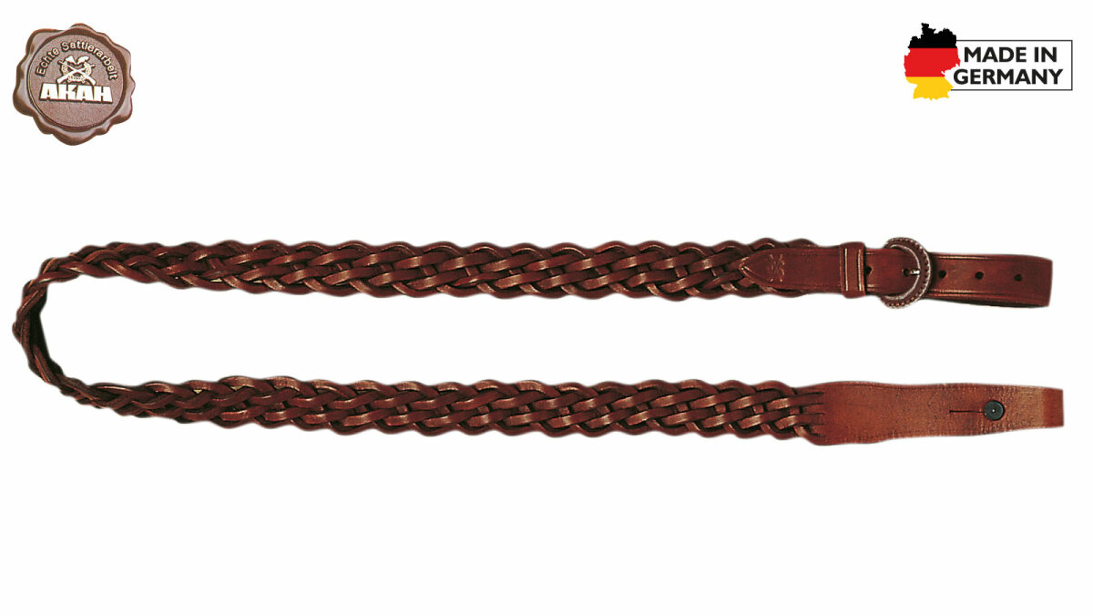 Unser hochwertiger AKAH Gewehrriemen aus braunem, ökologisch gegerbtem Rindkernleder überzeugt durch Qualität!  Er wurde von unseren erfahrenen AKAH Sattlern aus sechs Einzelriemen handgeflochten und ist extr em reißfest . Weiterhin verfügt er über eine lederüberzogene Schnalle.  Länge: 101 cm | Breite: 25 mm Bei dem AKAH Rindkernleder handelt es sich um den teuersten und hochwertigsten Teil einer Rinderhaut. Dieses Leder hat den Vorteil, dass es nicht dehnbar ist. Dies gewährleistet einen hohen Tragekomfort, da die Waffe nicht störend auf und ab wippen kann.