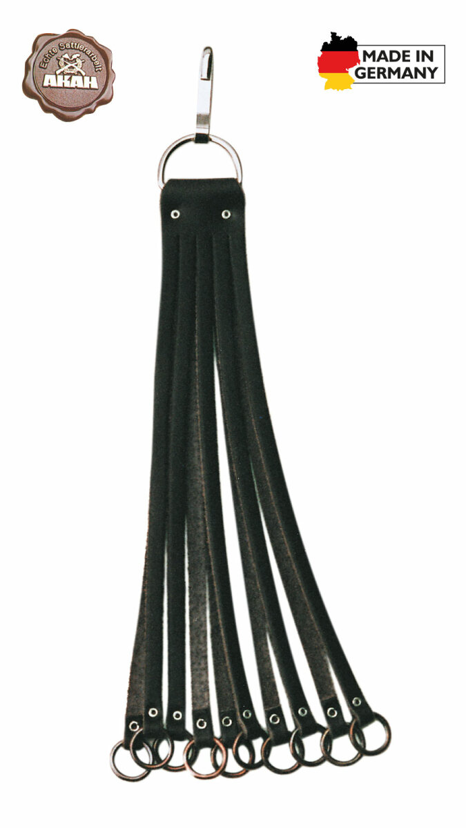 Bestes, durchgefärbtes Rind­vachetteleder, 10 Schlingen, Karabinerhaken.