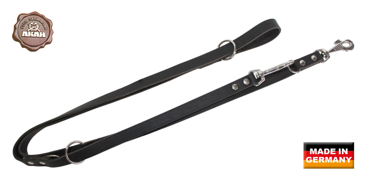 Diese dunkelbraune Polizeileine aus hochwertigem Vollrindleder eignet sich als Umhänge- und Führleine oder zum Führen von zwei Hunden . Sie ist auf vier Längen verstellbar , genietet und mit stabilen Bolzenhaken versehen.