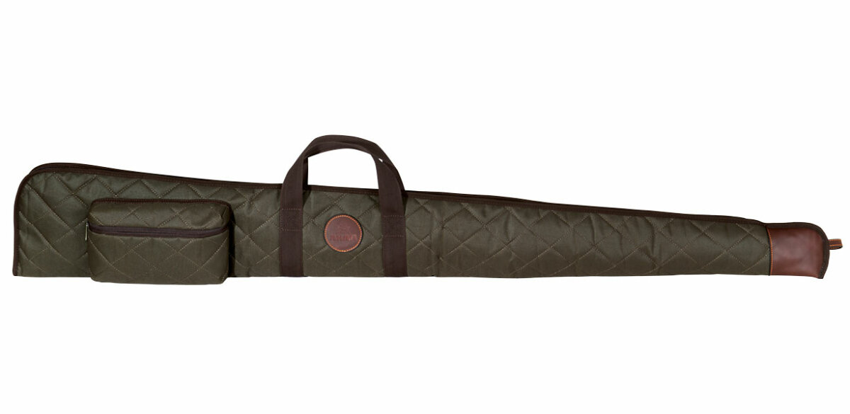 Das Futteral beeindruckt durch sein edles und klassisches Design. Es besteht aus aufwändig abgestepptem Textilgewebe aus grünem Nylon und präsentiert sich im alten englischen Stil, welcher an die traditionelle Jagd erinnert. Die dicke Innenpolsterung und die Lederverstärkung im Mündungsbereich verleihen zusätzlichen Schutz. Weiterhin verfügt das Futteral über eine praktische Vordertasche mit Reißverschluss, umlaufende Tragegriffe und einen verstellbaren Trageriemen. Außerdem verfügt es über eine Aufhängeschlaufe, einen robusten Zipper sowie eine Öse zur Befestigung eines Schlosses. Länge: 138cm