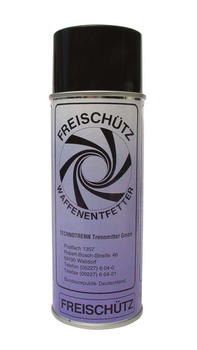 Entfernt Öle, Fette und Wachse. Gut zur Vorbereitung der Brünierung.  Hervorragendes Lösungsvermögen von fettHaltigen ölHaltigen und wachsHaltigen Verschmutzungen – Freischütz Waffenentfetter verdunstet rückstandfrei. Inhalt: 400 ml Spray