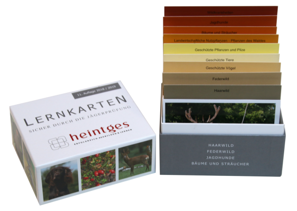 Produktinformationen Lernkarten Jägerprüfung Die Lernkarten Sicher durch die Jägerprüfung sind die optimale Ergänzung zu den Arbeitsblättern im Heintges-Kombi-System. Die effektive Unterstützung Ihrer Lernarbeit. Derzeit stehen folgende Themenkomplexe zur Verfügung: Haarwild Federwild Geschützte Vögel Geschützte Tiere Geschützte Pflanzen, Bäume und Sträucher Landwirtschaftliche Nutzpflanzen Jagdhunde Wildkrankheiten Die Kartenvorderseite zeigt eine Abbildung des Themenbereiches, die Rückseite enthält alle wichtigen Informationen hierzu. Die Lernkarten lassen sich leicht mitnehmen und eignen sich zum Lernen zwischendurch – in der Bahn, im Wartezimmer usw.
