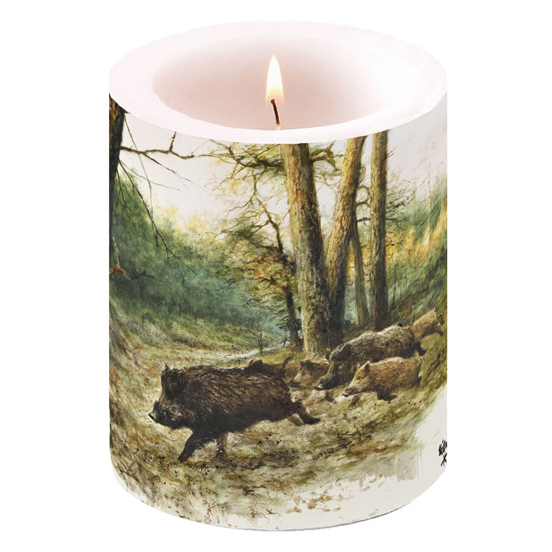 Stumpenkerze mit Motiv des unvergessenen niederländischen Jagdmalers Rien Poortvliet . Brennt nach innen ab und schimmert malerisch durch. Maße: Ø: 10 cm x Höhe :12 cm