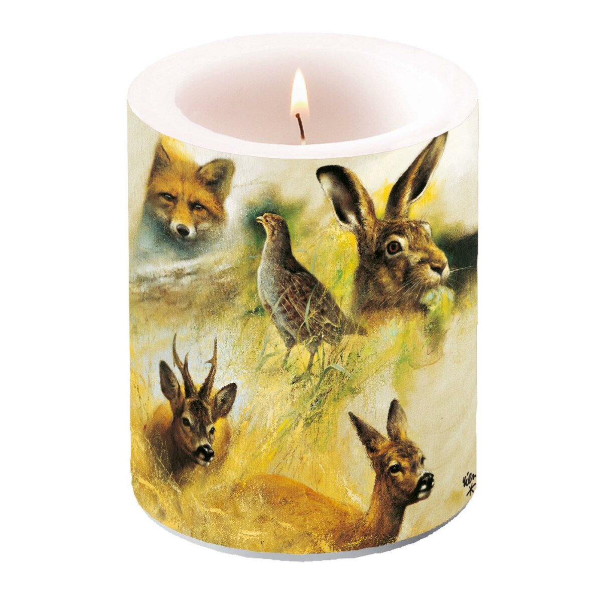 Stumpenkerze mit Motiv des unvergessenen niederländischen Jagdmalers „Rien Poortvliet“. Brennt nach innen ab und schimmert malerisch durch. Maße: Ø: 10 x Höhe: 12 cm