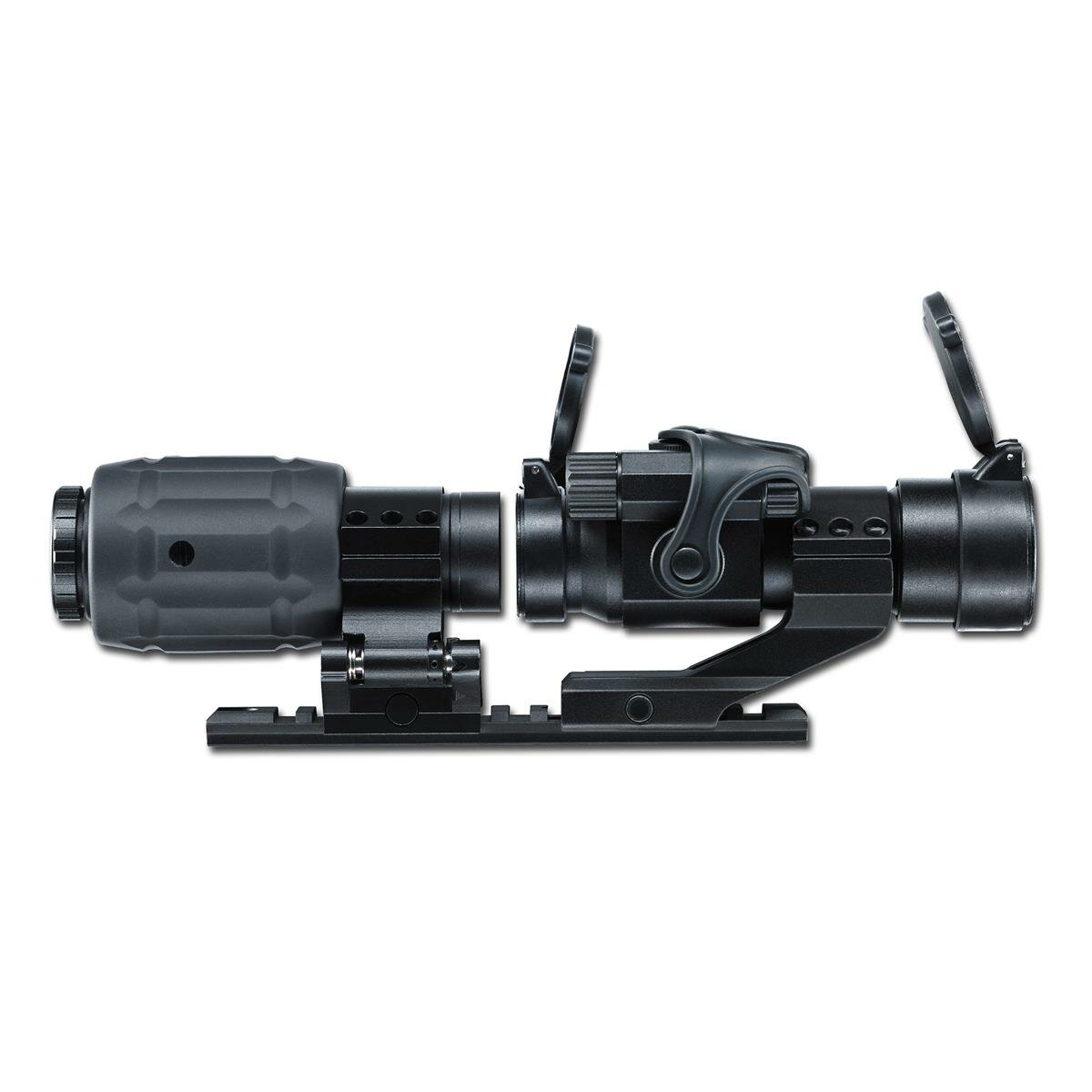 Das Walther Evolution PointSight 3 ist eine Kombination aus dem bekannten Rotpunktvisier PS 22 sowie einem Magnifier mit 3-facher Vergrößerung, welcher bei Nichtgebrauch einfach seitlich weggeklappt werden kann. Somit ist dieses Set für nahezu jede Gelegenheit geeignet, ob nun auf freiem Feld oder im CQB. Zum Betrieb des PS 22 werden zwei LR44 Batterien (enthalten) benötigt. Im Lieferumfang ist eine 15,5 cm lange 22 mm Schiene, ein Sechskantschlüssel und ebenso ein Tool zum Einstellen des PS 22 enthalten. Technische Daten PS 22: – Rotes Leuchtpunktabsehen (4 MOA) – 7-fach in der Helligkeit verstellbar – Höhen- und Seitenverstellbar – Objektiv-Durchmesser: 30 mm – Material: Aluminium, Kunststoff – Gewicht: ca. 275 g Technische Daten Magnifier: – 3-fache Vergrößerung – Objektiv-Durchmesser: 30 mm – Material: Aluminium, Gummi – Gewicht: 393 g